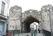 L'enceinte originelle comprenait seulement deux portes, l'une à l'ouest et l'autre à l'est. La première, face au port, est également appelée « Porte d'Or » (Porth-yr-Aur en gallois) à l'époque médiévale, en référence aux murailles de Constantinople[28],[29]. Elle était défendue par une herse jusqu'à des travaux menés au XIXe siècle qui ont vu l'ajout d'éléments gothiques[30]. La deuxième porte, à l'est, permettait d'entrer en ville depuis les terres. Elle surplombait la Cadnant, une rivière aujourd'hui recouverte[31]. Le corps de garde abrite des bureaux officiels jusqu'aux années 1960 : d'abord l'échiquier, puis l'hôtel de ville et enfin le hall de guilde[32],[23]. Il ne subsiste pas grand-chose du corps de garde originel depuis les travaux des XVIIIe et XIXe siècles, sinon la base des tours[24],[32]. Aux deux portes d'origine se sont ajoutées de nouvelles portes percées ultérieurement, dont Northgate, Greengate et l'entrée de Market Street[21].