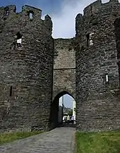 L'enceinte de Conwy forme un circuit quasiment ininterrompu de 1,3 km de long autour de la ville, pour une superficie enclose de 10 ha. Elle est remarquablement bien conservée, en partie parce que Conwy est restée une ville de faible taille[35],[36]. Elle est construite dans les mêmes matériaux que le château, à savoir du grès et du calcaire extraits dans la région, mais de la rhyolite a également été employée pour les niveaux supérieurs du mur est[37]. Les sources indiquent que le mur était à l'origine « plâtré » (daubed), sans que l'on sache exactement ce que recouvre ce terme ; il était peut-être blanchi à la chaux[38],[39]. Sur les 21 tours qui subsistent, la plupart n'ont pas de mur à l'arrière et comprenaient à l'origine des ponts en bois amovibles, afin d'isoler des sections de la muraille des assaillants[40],[41]. Un système inhabituel d'encorbellements offre un chemin de ronde plat et relativement large[42],[43].