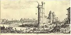 Détail du Plan de Mérian (Paris) en 1615, montrant la tour de Nesle, le mur, la porte de Buci ainsi que l'abbaye de Saint-Germain-des-Prés.