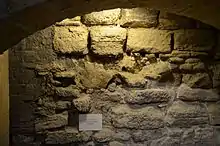 Base d'une tour de l'enceinte de Philippe Auguste, mise au jour lors des fouilles archéologiques dans l'Institut de France en 2015, avant la réalisation d'un nouveau bâtiment. L'enceinte marque la frontière entre l'Institut de France et la Monnaie de Paris. On voit également l'entrée d'un égout construit par Louis Le Vau dans les anciens fossés de l'enceinte, lors de la construction du Collège des Quatre-Nations au XVIIe siècle[57].