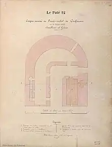 b. poternes dans le revers du flanc brisé (probablement bouchées à l'extérieur par de la terre en 1827)