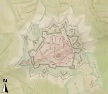 - Seul le plan de 1654 représente le flanc gauche avec un orillon, le plan Deventer et celui d'Olgiati & van Noyen représentent des flancs droits.
