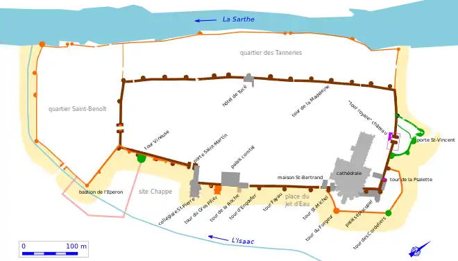 De cet ensemble, il subsiste la totalité du tracé en sous-sol et une bonne partie visible du mur d'enceinte, avec onze tours et trois poternes[4], essentiellement sur la façade ouest longeant la Sarthe. D'autres poternes existent, comprises dans les habitations.