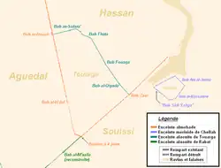 L'enceinte de Touarga, construite sous le règne de Moulay Abderrahmane[32], entre 1866 et 1867, est la plus récente de Rabat. Elle est constituée de deux segments perpendiculaires aux murailles almohades, s'embranchant respectivement au niveau de Bab er-Rouah au nord et de Bab Zaer au sud. Elle délimite une superficie de près d'un km2 englobant la commune de Touarga, dont le Palais royal, la mosquée Ahl Fâs, le méchouar — esplanade servant à des cérémonies en plein air — Essaïd, le département du chef du gouvernement et le ministère des Habous et des Affaires islamiques.