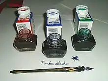 Actuellement, les encres pour l'écriture sont presque toutes basées sur des colorants chimiques, principalement nigrosine ou noir d'aniline[12]. Seules certaines encres destinées à des usages particuliers comme la calligraphie utilisent des pigments.