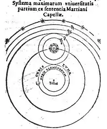 Martianus Capella, avocat vivant en Algérie, est l’auteur du De nuptiis Philologiae et Mercurii (Noces de Philologie et de Mercure), rédigé entre 410 et 429. Ce manuel sous forme de récit allégorique synthétise en 9 livres les connaissances de l’époque : philologie, grammaire, dialectique, rhétorique, géométrie, arithmétique, astronomie et harmonie. Cet ouvrage sera surtout populaire à l’époque carolingienne, où il servira de référence pour l’organisation des études dans le domaine littéraire (le trivium) et en mathématique (le quadrivium). Il est encore lu à la Renaissance et inspirera notamment Copernic.