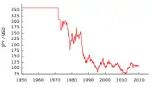 À la sortie de la Seconde Guerre mondiale, le président Harry S. Truman envoie le banquier Joseph Dodge préparer un plan de redressement économique du Japon. Celui-ci préconise de fixer un taux de change à 360 yen pour 1 dollar, afin d'assurer la compétitivité japonaise[1].