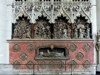 Enfeu de Gérard de Conchy, avec son gisant disposé sous un dais et un fronton à fleurons orné d'un médaillon trilobé, cathédrale Notre-Dame d'Amiens.