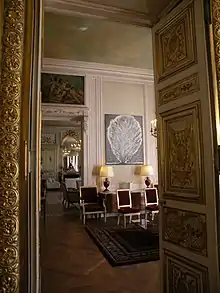 - Des pièces en enfilade ou d'enfilade, c'est-à-dire une suite de pièces s'ouvrant l'une sur l'autre, où toutes les ouvertures sont positionnées sur un même axe ; lorsqu'elles communiquent entre elles, sans couloir, leurs portes placées sur le même axe sont dites portes d'enfilade. Dans les chateaux, palais[1] et hôtels particuliers[2], l'enfilade des appartements de parade avaient notamment pour fonction la mise en scène de la représentation sociale, canalisant les visiteurs vers des lieux précis où la commodité était sacrifiée aux règles de l'étiquette et de la hiérarchie sociale. L'effet d'enfilade (perspective destinée à donner au visiteur un effet de profondeur et de grandeur)[3] pouvait être renforcé par des éléments d'architectonique, des tableaux, le couple miroir de cheminée et miroir de console « susceptible de refléter à l'infini la profondeur des salons et les toilettes féminines au cours des réceptions[4] » ; ainsi, l'enfilade le long de la façade, qui met en relation les pièces nobles, est destinée à montrer au visiteur la richesse du propriétaire qui est proportionnelle à la longueur de cette perspective[5].
