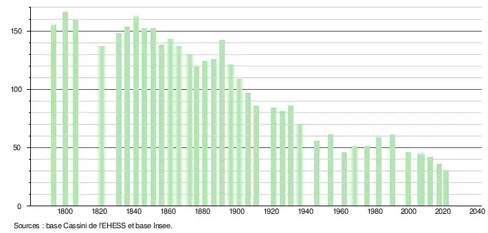 L'évolution du nombre d'habitants est connue à travers les recensements de la population effectués dans la commune depuis 1793. Pour les communes de moins de 10 000 habitants, une enquête de recensement portant sur toute la population est réalisée tous les cinq ans, les populations légales des années intermédiaires étant quant à elles estimées par interpolation ou extrapolation[15]. Pour la commune, le premier recensement exhaustif entrant dans le cadre du nouveau dispositif a été réalisé en 2007[16].