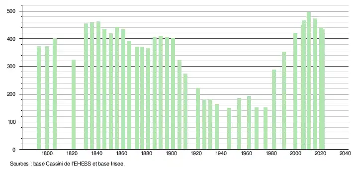 L'évolution du nombre d'habitants est connue à travers les recensements de la population effectués dans la commune depuis 1793. Pour les communes de moins de 10 000 habitants, une enquête de recensement portant sur toute la population est réalisée tous les cinq ans, les populations légales des années intermédiaires étant quant à elles estimées par interpolation ou extrapolation[32]. Pour la commune, le premier recensement exhaustif entrant dans le cadre du nouveau dispositif a été réalisé en 2005[33].