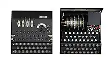 Enigma est une machine électromécanique portative servant au chiffrement et au déchiffrement de l'information. Elle fut inventée par l'Allemand Arthur Scherbius, reprenant un brevet du Néerlandais Hugo Koch, datant de 1919[1],[2]. Enigma fut utilisée principalement par l’Allemagne nazie (Die Chiffriermaschine Enigma) pendant la Seconde Guerre mondiale. Le terme « Enigma » désigne en fait toute une famille de machines, car il en a existé de nombreuses et subtiles variantes, commercialisées en Europe et dans le reste du monde à partir de 1923. Elle fut aussi adoptée par les services militaires et diplomatiques de nombreuses nations.