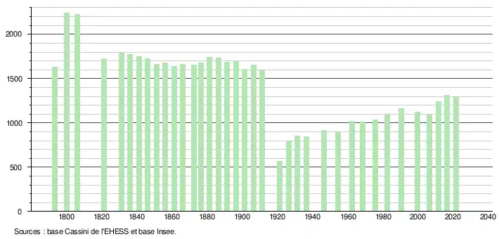 L'évolution du nombre d'habitants est connue à travers les recensements de la population effectués dans la commune depuis 1793. Pour les communes de moins de 10 000 habitants, une enquête de recensement portant sur toute la population est réalisée tous les cinq ans, les populations légales des années intermédiaires étant quant à elles estimées par interpolation ou extrapolation[31]. Pour la commune, le premier recensement exhaustif entrant dans le cadre du nouveau dispositif a été réalisé en 2006[32].