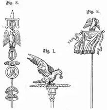 L’aquila (« aigle »), représente la légion depuis la réforme marianique en -104. Avant cette date, elle n’est que la première de cinq enseignes représentant la légion : l’aigle, le loup, le minotaure, le cheval et le sanglier. Il est porté par l’aquilifer et est rattaché à la première cohorte[17]. Symbole et protecteur de la légion, l’aigle reste la majeure partie du temps à l’abri dans l’autel du camp et n’accompagne les troupes que lorsque c’est l’ensemble de la légion qui se met en marche[18]. L’utilisation de l’aigle dure dans l’Empire d’Occident jusqu’à la disparition de celui-ci, puis persiste encore jusqu’au VIIe siècle dans l’Empire d’Orient[19].