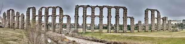 L'aqueduc des Miracles fait partie de la conduite (ou aqueduc) qui acheminait l'eau à Emerita Augusta depuis le Réservoir de Proserpine, situé à 5 km de la ville. L'eau parvenait à un castellum (bassin de décantation) situé dans l'actuel quartier de Santa Eulalia (les ruines en sont encore visibles). De là s'élançait le pont sur 827 mètres, jusqu'au castellum terminal du Cerro de El Calvario, après avoir traversé la vallée de l'Albarregas, qu'il surplombe à une hauteur maximale de 25 mètres. Il fut érigé au début du Ier siècle en associant la pierre et la brique. Les piliers, de 3 mètres de côté sont reliées par des séries de trois arcs en plein-cintre en brique superposés. Sur les arcs supérieurs reposait le canal d'acheminement de l'eau.