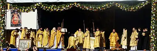 - On emploie dans cette description le terme « diacre » au singulier, mais il peut ne pas y avoir de diacre — auquel cas le rituel est légèrement modifié — ou bien plusieurs diacres et sous-diacres, selon l'importance du service (importance de la fête, du sanctuaire, présence ou non de l'évêque, nombre de fidèles, etc.)