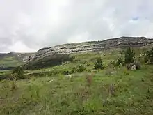 - la nappe de Digne à l'est[3], au niveau du lobe de Valavoire[4] : il s'agit d'une nappe de charriage, c'est-à-dire d'une dalle épaisse de près de 5 000 m qui s'est déplacée vers le sud-ouest durant l'Oligocène et la fin de la formation des Alpes. Les lobes (ou écailles) correspondent à la bordure découpée à l'ouest de la nappe ;