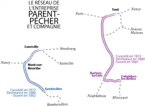 Monsieur Parent-Pécher décède le . En conséquence, la concession des lignes est résiliée pour défaut de commencement des travaux dans les temps prévus en , et reprise par le département de Meurthe-et-Moselle moyennant finances, département qui abandonne ses droits, gratuitement, à l'État, lequel confie en 1881 et 1882 l'exploitation des lignes à l'Est.