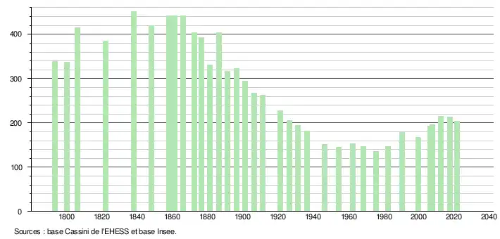 L'évolution du nombre d'habitants est connue à travers les recensements de la population effectués dans la commune depuis 1793. Pour les communes de moins de 10 000 habitants, une enquête de recensement portant sur toute la population est réalisée tous les cinq ans, les populations légales des années intermédiaires étant quant à elles estimées par interpolation ou extrapolation[25]. Pour la commune, le premier recensement exhaustif entrant dans le cadre du nouveau dispositif a été réalisé en 2007[26].