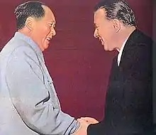 En 1956, trois ans après la mort de Staline, Nikita Khrouchtchev prône la déstalinisation. La rupture est bientôt consommée entre l'Albanie et l'URSS : lors de la conférence mondiale des quatre-vingt-un PC, en 1960, Hoxha dénonce la non-livraison de blé soviétique à l'Albanie et déclare à la tribune : « Les rats soviétiques sont nourris, alors que le peuple albanais meurt de faim »[23] ce qui provoque un scandale énorme ; en février 1961, au cours du IVe Congrès du Parti du Travail, Hoxha attaqua violemment la direction du PCUS, ce qui provoqua l'expulsion de l'attaché militaire albanais d'URSS ; le PC albanais fut absent du XXIIe Congrès du PCUS, réuni à Moscou quelques mois plus tard. Hoxha procède alors à une sévère purge sanglante au sein de l'armée, pour prévenir un coup d'état. En revanche, la Chine, à la recherche d'alliés, accroît son aide à Tirana et conclut en 1961 une alliance officielle.