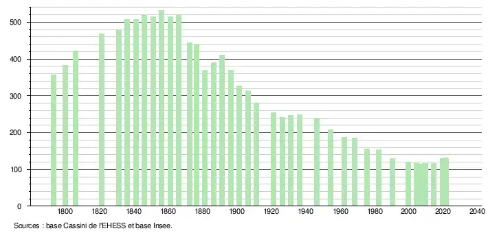 L'évolution du nombre d'habitants est connue à travers les recensements de la population effectués dans la commune depuis 1793. Pour les communes de moins de 10 000 habitants, une enquête de recensement portant sur toute la population est réalisée tous les cinq ans, les populations légales des années intermédiaires étant quant à elles estimées par interpolation ou extrapolation[30]. Pour la commune, le premier recensement exhaustif entrant dans le cadre du nouveau dispositif a été réalisé en 2004[31].