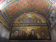 Le titre honorifique Episcopa, fait référence à Théodora, mère du pape Pascal Ier, qui lui a construit la chapelle de son vivant, comme l'indique l'auréole carrée de la mosaïque. Théodora était connue pour être une fervente chrétienne dans l'Église primitive.