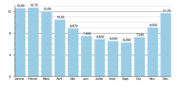 La rivière présente un régime très régulier, avec de faibles fluctuations saisonnières de débit. Les hautes eaux sont hivernales et poussent les moyennes mensuelles à un niveau de 10,5 à 12,7 m3/s de décembre à avril inclus. Les basses eaux d'été, d'août à octobre, restent confortables et caractérisées par une faible baisse du débit moyen mensuel, jusque 6,26 m3/s au mois d'août[2].