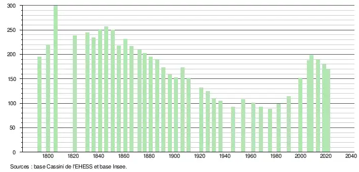 L'évolution du nombre d'habitants est connue à travers les recensements de la population effectués dans la commune depuis 1793. Pour les communes de moins de 10 000 habitants, une enquête de recensement portant sur toute la population est réalisée tous les cinq ans, les populations légales des années intermédiaires étant quant à elles estimées par interpolation ou extrapolation[22]. Pour la commune, le premier recensement exhaustif entrant dans le cadre du nouveau dispositif a été réalisé en 2008[23].