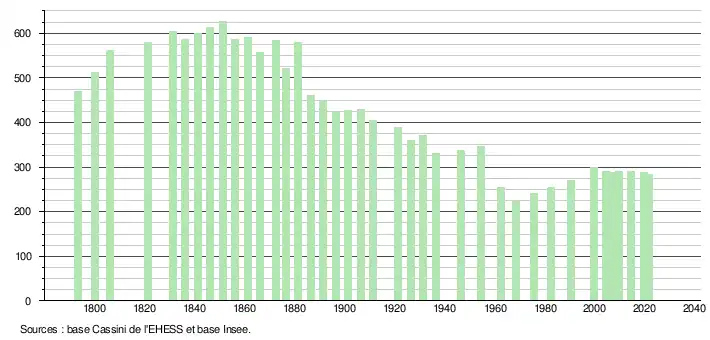 L'évolution du nombre d'habitants est connue à travers les recensements de la population effectués dans la commune depuis 1793. Pour les communes de moins de 10 000 habitants, une enquête de recensement portant sur toute la population est réalisée tous les cinq ans, les populations légales des années intermédiaires étant quant à elles estimées par interpolation ou extrapolation[22]. Pour la commune, le premier recensement exhaustif entrant dans le cadre du nouveau dispositif a été réalisé en 2004[23].