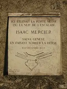 Érigée par la volonté de la Compagnie de 1602 en 1938, cette inscription rappelle tout à la fois la topographie des lieux à l'époque de l'Escalade : le tracé du Bastion de l'Oie y est visible ; et l'acte héroïque d'Isaac Mercier.
