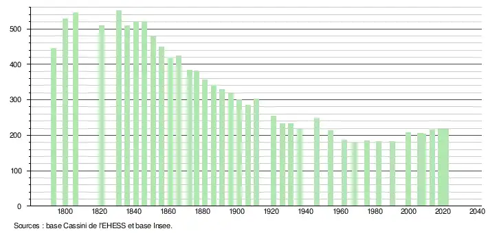 L'évolution du nombre d'habitants est connue à travers les recensements de la population effectués dans la commune depuis 1793. Pour les communes de moins de 10 000 habitants, une enquête de recensement portant sur toute la population est réalisée tous les cinq ans, les populations légales des années intermédiaires étant quant à elles estimées par interpolation ou extrapolation[23]. Pour la commune, le premier recensement exhaustif entrant dans le cadre du nouveau dispositif a été réalisé en 2008[24].