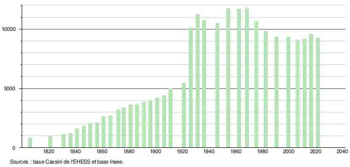 L'évolution du nombre d'habitants est connue à travers les recensements de la population effectués dans la commune depuis 1806. Pour les communes de moins de 10 000 habitants, une enquête de recensement portant sur toute la population est réalisée tous les cinq ans, les populations légales des années intermédiaires étant quant à elles estimées par interpolation ou extrapolation[25]. Pour la commune, le premier recensement exhaustif entrant dans le cadre du nouveau dispositif a été réalisé en 2006[26].