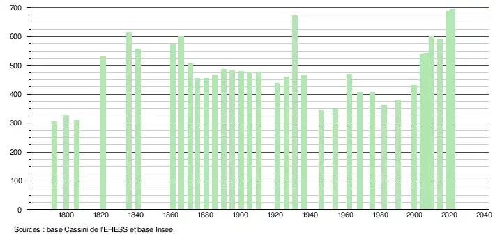 L'évolution du nombre d'habitants est connue à travers les recensements de la population effectués dans la commune depuis 1793. Pour les communes de moins de 10 000 habitants, une enquête de recensement portant sur toute la population est réalisée tous les cinq ans, les populations légales des années intermédiaires étant quant à elles estimées par interpolation ou extrapolation[17]. Pour la commune, le premier recensement exhaustif entrant dans le cadre du nouveau dispositif a été réalisé en 2004[18].