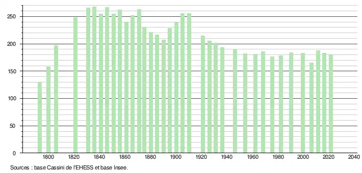 L'évolution du nombre d'habitants est connue à travers les recensements de la population effectués dans la commune depuis 1793. Pour les communes de moins de 10 000 habitants, une enquête de recensement portant sur toute la population est réalisée tous les cinq ans, les populations légales des années intermédiaires étant quant à elles estimées par interpolation ou extrapolation[19]. Pour la commune, le premier recensement exhaustif entrant dans le cadre du nouveau dispositif a été réalisé en 2006[20].