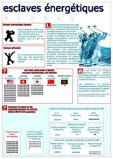 En Suisse, en 2001, une exposition présente une définition vulgarisée des "esclaves énergétiques" sur la base des travaux menés par Tourane Corbière-Nicollier sous la tutelle d'Olivier Joillet du laboratoire EPFL-GECOS à Lausanne. La définition donnée est : "L'esclave énergétique est une unité de mesure qui permet de mieux comprendre et évaluer les conséquences de nos choix de vie. Un esclave énergétique travaille pour produire de l'énergie 24h sur 24. Il dégage une puissance moyenne de 100 W (soit 875 kWh/an)."[réf. nécessaire]