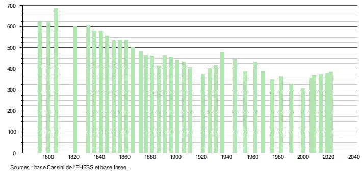 L'évolution du nombre d'habitants est connue à travers les recensements de la population effectués dans la commune depuis 1793. Pour les communes de moins de 10 000 habitants, une enquête de recensement portant sur toute la population est réalisée tous les cinq ans, les populations légales des années intermédiaires étant quant à elles estimées par interpolation ou extrapolation[27]. Pour la commune, le premier recensement exhaustif entrant dans le cadre du nouveau dispositif a été réalisé en 2008[28].