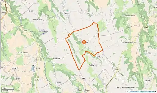 Les communes les plus proches[Note 2] sont[4] : Riupeyrous (2,0 km), Barinque (2,5 km), Sévignacq (3,1 km), Monassut-Audiracq (3,8 km), Lasclaveries (4,3 km), Anos (4,5 km), Lussagnet-Lusson (4,5 km), Higuères-Souye (4,5 km).