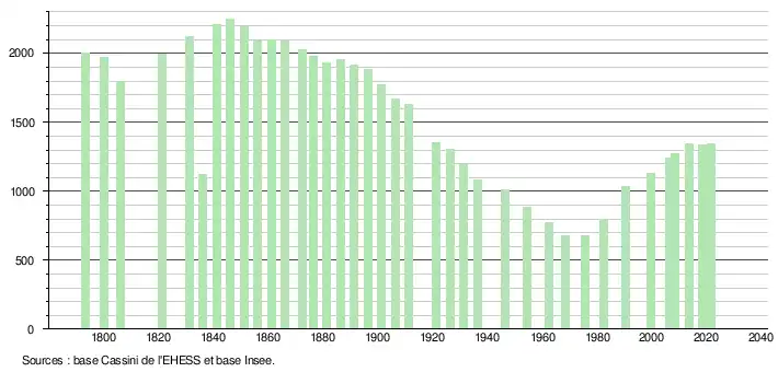 L'évolution du nombre d'habitants est connue à travers les recensements de la population effectués dans la commune depuis 1793. Pour les communes de moins de 10 000 habitants, une enquête de recensement portant sur toute la population est réalisée tous les cinq ans, les populations légales des années intermédiaires étant quant à elles estimées par interpolation ou extrapolation[16]. Pour la commune, le premier recensement exhaustif entrant dans le cadre du nouveau dispositif a été réalisé en 2008[17].