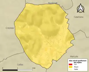 Le retrait-gonflement des sols argileux est susceptible d'engendrer des dommages importants aux bâtiments en cas d’alternance de périodes de sécheresse et de pluie. La totalité de la commune est en aléa moyen ou fort (67,7 % au niveau départemental et 48,5 % au niveau national). Sur les 437 bâtiments dénombrés sur la commune en 2019, 437 sont en aléa moyen ou fort, soit 100 %, à comparer aux 72 % au niveau départemental et 54 % au niveau national. Une cartographie de l'exposition du territoire national au retrait gonflement des sols argileux est disponible sur le site du BRGM[21],[Carte 2].