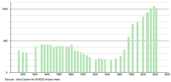L'évolution du nombre d'habitants est connue à travers les recensements de la population effectués dans la commune depuis 1793. Pour les communes de moins de 10 000 habitants, une enquête de recensement portant sur toute la population est réalisée tous les cinq ans, les populations légales des années intermédiaires étant quant à elles estimées par interpolation ou extrapolation[39]. Pour la commune, le premier recensement exhaustif entrant dans le cadre du nouveau dispositif a été réalisé en 2007[40].