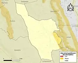 Le retrait-gonflement des sols argileux est susceptible d'engendrer des dommages importants aux bâtiments en cas d’alternance de périodes de sécheresse et de pluie[31]. 5,3 % de la superficie communale est en aléa moyen ou fort (59 % au niveau départemental et 48,5 % au niveau national)[Carte 3]. Depuis le , en application de la loi ELAN, différentes contraintes s'imposent aux vendeurs, maîtres d'ouvrages ou constructeurs de biens situés dans une zone classée en aléa moyen ou fort[Note 5],[32].