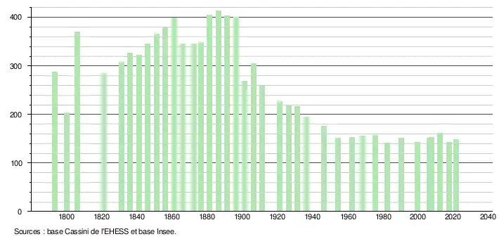 L'évolution du nombre d'habitants est connue à travers les recensements de la population effectués dans la commune depuis 1793. Pour les communes de moins de 10 000 habitants, une enquête de recensement portant sur toute la population est réalisée tous les cinq ans, les populations légales des années intermédiaires étant quant à elles estimées par interpolation ou extrapolation[42]. Pour la commune, le premier recensement exhaustif entrant dans le cadre du nouveau dispositif a été réalisé en 2007[43].