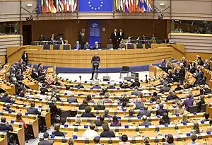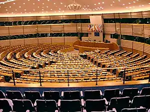 Les députés débattent dans un hémicycle et sont installés de gauche à droite en fonction de leur appartenance politique. Cependant, les membres non-inscrits sont assis vers la droite de l'anneau extérieur et n'ont pas de places avant. Chaque place est équipée d'un micro, d'un casque pour écouter les interprètes et d'un bouton de vote électronique. Les chefs de groupes s'asseyent au premier rang au centre, la place la plus centrale est occupée par un podium destiné aux intervenants. Derrière eux se trouvent un drapeau de l'Union européenne ainsi que les drapeaux nationaux.