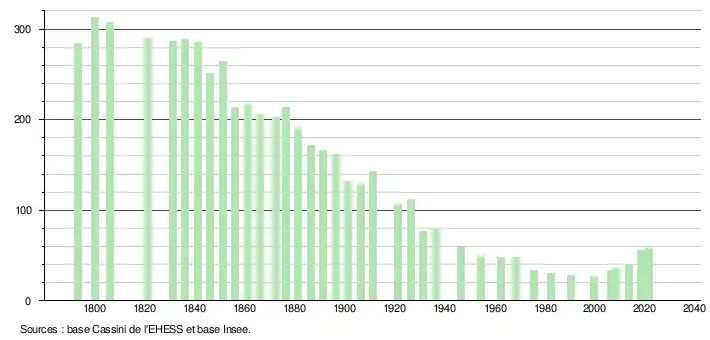 L'évolution du nombre d'habitants est connue à travers les recensements de la population effectués dans la commune depuis 1793. Pour les communes de moins de 10 000 habitants, une enquête de recensement portant sur toute la population est réalisée tous les cinq ans, les populations légales des années intermédiaires étant quant à elles estimées par interpolation ou extrapolation[22]. Pour la commune, le premier recensement exhaustif entrant dans le cadre du nouveau dispositif a été réalisé en 2008[23].