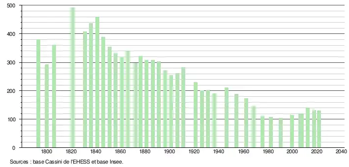 L'évolution du nombre d'habitants est connue à travers les recensements de la population effectués dans la commune depuis 1793. Pour les communes de moins de 10 000 habitants, une enquête de recensement portant sur toute la population est réalisée tous les cinq ans, les populations légales des années intermédiaires étant quant à elles estimées par interpolation ou extrapolation[12]. Pour la commune, le premier recensement exhaustif entrant dans le cadre du nouveau dispositif a été réalisé en 2007[13].