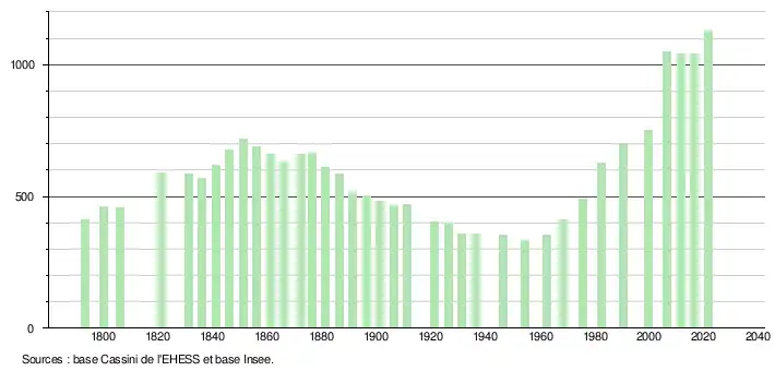 L'évolution du nombre d'habitants est connue à travers les recensements de la population effectués dans la commune depuis 1793. Pour les communes de moins de 10 000 habitants, une enquête de recensement portant sur toute la population est réalisée tous les cinq ans, les populations légales des années intermédiaires étant quant à elles estimées par interpolation ou extrapolation[27]. Pour la commune, le premier recensement exhaustif entrant dans le cadre du nouveau dispositif a été réalisé en 2006[28].
