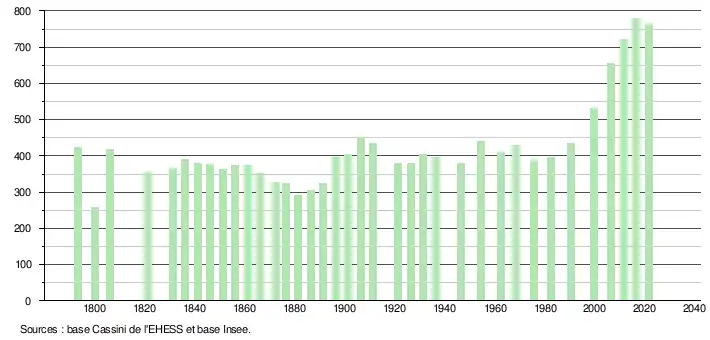 | L'évolution du nombre d'habitants est connue à travers les recensements de la population effectués dans la commune depuis 1793. Pour les communes de moins de 10 000 habitants, une enquête de recensement portant sur toute la population est réalisée tous les cinq ans, les populations légales des années intermédiaires étant quant à elles estimées par interpolation ou extrapolation[22]. Pour la commune, le premier recensement exhaustif entrant dans le cadre du nouveau dispositif a été réalisé en 2006[23]. En 2021, la commune comptait 764 habitants[Note 3], en diminution de 0,26 % par rapport à 2015 (Gironde : +6,88 %, France hors Mayotte : +1,84 %). |