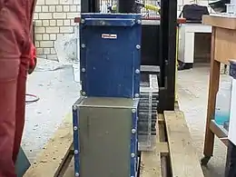 La boîte en L est une boîte en acier avec deux parties, l’une verticale et l’autre horizontale, séparées par une trappe et une grille de deux ou de trois barres de diamètre et d’espacement fixé. L’essai se déroule en suivant les étapes suivantes :