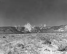 L’essai souterrain suivant est Ess de la campagne d'essais Teapot, le 23 mars 1955[8]. L'explosion d’une kilotonne est un essai de fonctionnement d'une munition de démolition atomique (MDA)[13]. Il a explosé à 20,4 mètres sous terre, dans un abri de tôle ondulée, recouvert de sacs de sable et de tout venant[14]. Parce que le MDA est enfoui sous terre, l'explosion a soufflé vers le haut des tonnes de terre, créant un cratère de 90 m de large et 39 m de profondeur[14]. Le nuage en forme de champignon résultant s'est élevé à une hauteur de 12 000 pieds (3 660 m), les retombées radioactives ont dérivé en direction de l'est, voyageant à 225 km du point zéro[13].