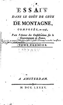Les Essais est l'œuvre majeure de Michel de Montaigne ; elle fut publiée pour la première fois en 1580. L’œuvre traite de nombre de sujets, sans ordre apparent : médecine, arts, livres, affaires domestiques, histoire ancienne, chevaux, maladie[n 1] entre autres, auxquels Montaigne mêle des réflexions sur sa propre vie et sur l'Homme, le tout formant « un pêle-mêle où se confondent comme à plaisir les choses importantes et futiles, les côtés vite surannés et l’éternel[1]. » Les Essais se composent de 3 tomes (ou livres) contenant en tout 107 chapitres.